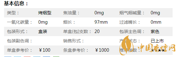 | 煙長(zhǎng):97mm | 過(guò)濾嘴長(zhǎng):25mm | 包裝形式:條盒硬盒細(xì)支 | 單盒(包)支數(shù):20 |