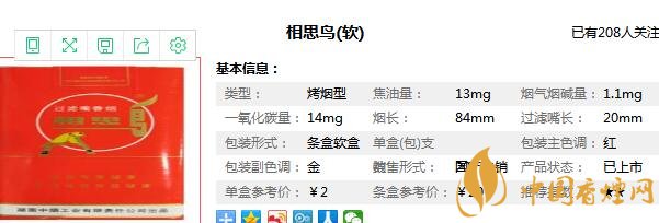 相思鳥(軟)香煙,從品牌知名度來看,相思鳥和紅豆獲得過各種獎項,在消費者心目中也有較好口碑。售紅火的時候,京廣鐵路沿線省份都可以見到相思鳥的身影。