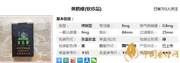 黃鶴樓軟珍品,作為黃鶴樓系列的高檔香煙,這款煙民中口碑上佳的“軟珍品”香煙,放眼國烤60檔市場,除了此檔次中的霸主軟中外,黃鶴樓軟珍、芙蓉王軟藍、云煙棕印象可算是此檔次中的三杰,那么在對黃鶴樓軟珍品圖片價格進行介紹之前,先來看一看黃鶴樓軟珍品多少錢一包,這款香煙的價格為65元/包。