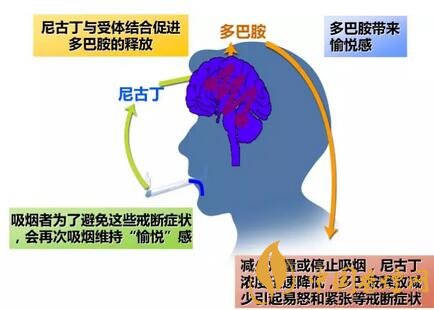 尼古丁在體內(nèi)代謝速度非???,不抽煙的時候,尼古丁濃度的迅速降低造成多巴胺釋放量減少,因而產(chǎn)生煩躁、焦慮等戒斷癥狀,身體就會渴求再次吸煙以獲得尼古丁來避免戒斷癥狀,這就是尼古丁成癮的本質(zhì)。