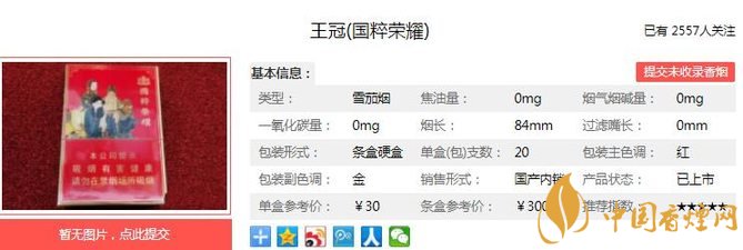 王冠國粹榮耀煙支長84mm,20支一包,是一款雪茄煙。煙支很松軟,紅色類似塑料的煙嘴,上面有國粹榮耀四字和祥云般圖案圍繞,造型上挺有雪茄的感覺。下面我們一起來看王冠國粹榮耀的參數(shù)信息:焦油量:中