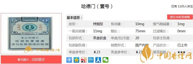山東中煙是一個(gè)飽含人文情懷的企業(yè),哈德門(壹號(hào))穿越歷史煙云,尋覓最初的味道,致敬一段歷史,致敬一段情懷,重新上市。經(jīng)小編市場調(diào)查哈德門(壹號(hào))售價(jià)為23元/包。