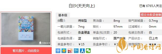 保持白沙品牌醇和的產(chǎn)品風格,突出香氣豐富厚實、飄逸和余味純凈、津甜的質量特色。以優(yōu)雅煙草本香和煙草成熟甜香為底韻,襯以堅果香、清新果甜香;香氣細膩、飄揚、豐富、綿長;煙氣悠滿、醇和;口感生津返甜。。經(jīng)香煙網(wǎng)小編市場調查白沙天天向上售價為15元/包。