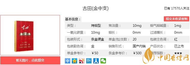 古田金中支煙支長84mm,過濾嘴長25mm,定位在中支煙品類。捏一捏煙支,煙絲填充飽滿,切口整齊,仔細觀察并沒有發(fā)現(xiàn)降焦孔。下面我們一起來看古田金中支的參數(shù)信息:焦油量:10mg 煙堿量:1.0mg 一氧化碳量:10mg