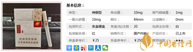 類型 :烤煙型 焦油量 :10mg 煙氣煙堿量 :1mg 一氧化碳量 :10mg