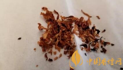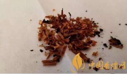 煙絲從外觀上檢視,由棕黃和明黃煙絲組成,品級(jí)不錯(cuò)。煙絲切寬1mm左右。間雜切成細(xì)小圓片裝的煙梗。用料還是比較考究的。
