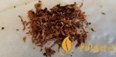 攤開煙絲,明黃、棕黃的烤煙煙絲比例較大,間雜有比例稍小的深棕色的晾煙煙絲,未見涂布制絲和膨脹制絲。里面混雜與切成薄片狀的煙梗。從煙絲外觀看,煙葉的品級非常好,用料實在。