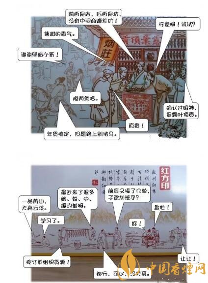 細(xì)看,正面的“前店”是一條古徽州商業(yè)街的圖樣,人頭攢動(dòng)、熙熙攘攘,掛著“露葉頂貢”招牌的紅方印煙莊占據(jù)了C位,門口的“文幫”掌柜手持一片煙葉接受眾人圍觀;背面的“后坊”,則描繪了“武幫”的手工匠人們曬煙、制絲的勞作場(chǎng)景??上D案只能繪色、不能繪聲,假如身臨其境,會(huì)聽到什么樣的聲音呢?惡搞一下吧……