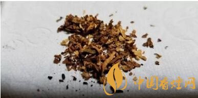 攤開煙絲,明黃的烤煙和暗棕的晾煙比例基本接近1:1。有切得很細碎的煙梗交雜其間??緹煴壤饶β甯绨姹疽愿咭恍?。