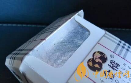 煙盒的高度是97mm。正反兩面的圖案設(shè)計(jì)相同,都是有如床單或者臺(tái)布樣式的畫面。九宮格樣式的中間,印制有金橋品牌香煙的LOGO,以及英倫奶香的名稱。從警示語句內(nèi)容來看,是大字版本初期款,2016年10月改版前的款式。