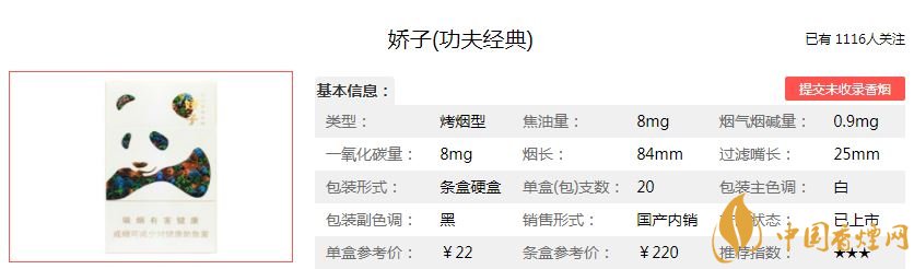 嬌子功夫經(jīng)典煙支長(zhǎng)97mm,過濾嘴長(zhǎng):25mm,“香草增香遮蓋技術(shù)”可以遮蓋煙草燃燒后吸附在身體、室內(nèi)、車內(nèi)的煙味,同時(shí)凸顯出煙草與甜香草協(xié)調(diào)的香味特點(diǎn),較好地體現(xiàn)出香味型中式卷煙創(chuàng)新產(chǎn)品特色。下面我們一起來看嬌子功夫經(jīng)典的參數(shù)信息:焦油量:8mg 煙堿量:0.9mg 一氧化碳量:8mg