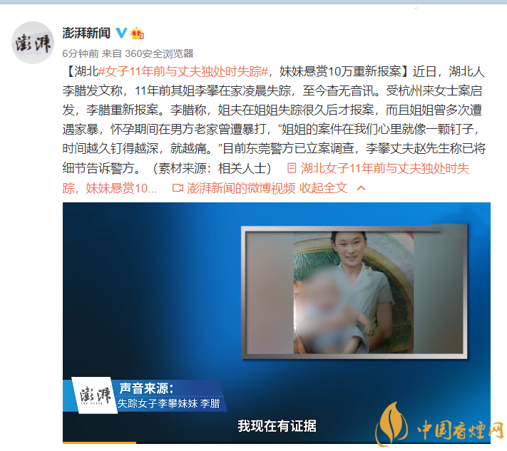 以上就是對湖北女子11年前與丈夫獨處時失蹤,妹妹重新報案的事件報道,具體事件發(fā)展還要等警方調(diào)查結(jié)果,后續(xù)發(fā)展我們將繼續(xù)跟進。想了解更多時事熱點,請關(guān)注香煙網(wǎng)!