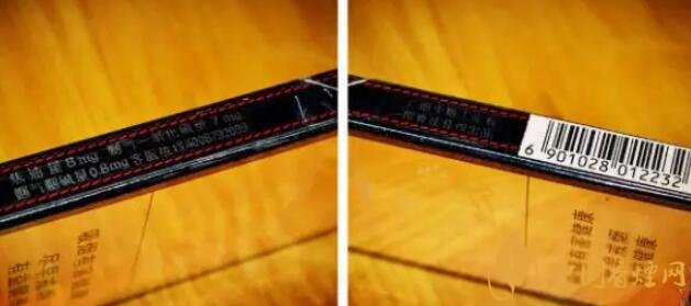 左側:真龍香煙燃情時光顯示了焦油量8MG/煙堿0.8MG/煙氣7MG,細支里來說屬于中上水平了,并有客服熱線。右側則是出品方廣西中煙和條形碼。