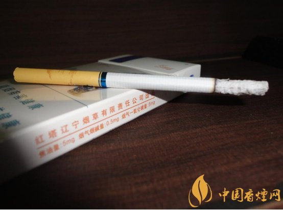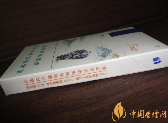 煙盒的右側(cè)注明了理化數(shù)值,紅塔遼寧煙草有限責(zé)任公司出品方名稱,焦油量:5mg、煙氣煙堿量:0.5mg、煙氣一氧化碳量:5mg,還印有顯眼的深藍色環(huán)保標(biāo)識。