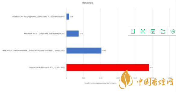 再來看看開源視頻轉(zhuǎn)碼工具 Handbrake,MacBook Air 完成將一段 12 分鐘的 4K 視頻轉(zhuǎn)碼成 1080p H.265 文件的速度是 Surface 的 6 倍。