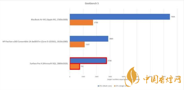 MacBook Air 在 Geekbench 5 的單核和多核測試中都碾壓了 Surface Pro X。蘋果的新筆記本在單核過程中獲得了 1730 分,比 Surface 的分?jǐn)?shù)高出 1000 多分。多核測試則顯示出更大的差距,MacBook Air 的成績?yōu)?7454 分,而 Surface 的成績?yōu)?2734 分。