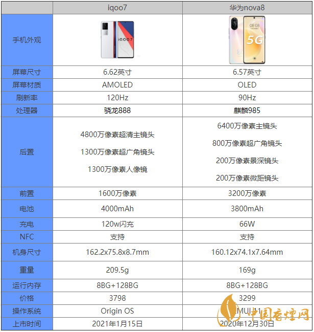 近期剛剛發(fā)布的iqoo7手機,許多朋友對這款手機非常關(guān)注,那么對比華為nova8這兩款手機有什么區(qū)別,哪款手機更好,哪款手機更值得入手?下面香煙網(wǎng)小編將對iqoo7和華為nova8參數(shù)配置對比進行介紹,感興趣的朋友一起來看看吧!