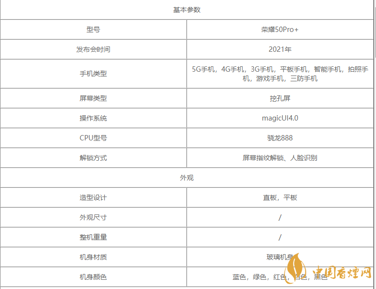 以上是小編整理的有關(guān)榮耀50pro參數(shù)配置怎么樣-榮耀50pro參數(shù)詳細參數(shù)一覽的最新信息,相信在座的朋友們聽到小編的介紹有所認識,但是小編在這里提醒一句以上信息整合于網(wǎng)絡(luò),更多最新最實用的資訊請持續(xù)關(guān)注香煙網(wǎng)。