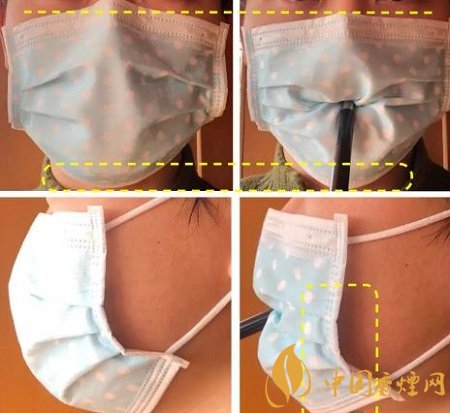 從正面看,因?yàn)樽觳亢?ldquo;香煙”的緣故,原本被金屬條緊貼鼻梁的口罩上沿滑下,使得鼻梁兩側(cè)出現(xiàn)明顯空隙;而口罩下沿也因此收窄,出現(xiàn)“通風(fēng)口”。從側(cè)面看,嘴含住“香煙“的同時(shí),部分口罩也被塞入嘴中,口罩兩側(cè)受到向中間拉扯的力量,不再貼合臉頰。