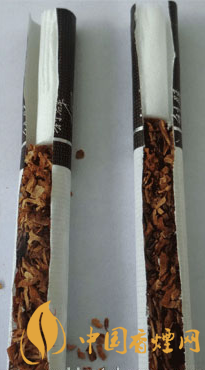 煙支降焦工藝差異比對:真品煙支采用34mm長度的聯(lián)合效益通風槽濾嘴,有效降低焦油和一氧化碳量,又充分保留香氣;假煙煙支采用普通單一濾嘴棒,其濾嘴棒長度較短,無法達降低焦油和一氧化碳量理化數(shù)值效果。