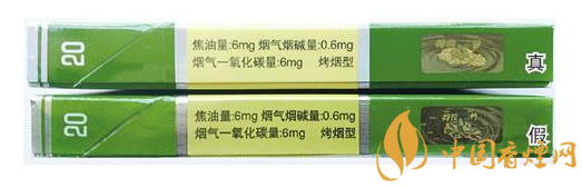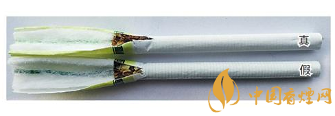 真煙過濾嘴中的綠色香線較細(xì),顏色也較淡,卷煙紙上線條呈網(wǎng)格狀;假煙過濾嘴中的綠色香線較粗,顏色也較深,卷煙紙上線條為橫螺紋。
