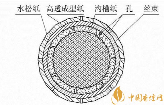 溝槽濾嘴:是一種由于特殊結(jié)構(gòu)的溝槽純纖維紙包囊醋酸纖維絲束濾芯制成。簡單來說,就是在醋酸濾芯的外圍先包覆一層溝槽纖維素紙,然后包裹一層成形紙而成。溝槽纖維素紙的表面是通長的溝槽段或者是溝槽段和平坦段組合構(gòu)成。其作用一方面可以有效減小吸阻提高通透感。另一方面增大煙氣與濾嘴的接觸的表面積,快速降低煙氣溫度和增加對煙氣有害物質(zhì)的過濾和吸附。