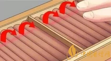 將雪茄放在濕度稍大如地下室之類(lèi)的地方約一星期(如果雪茄特別干燥,可適當(dāng)延長(zhǎng)時(shí)間)。而后將雪茄放置在濕度為70%的保溫盒內(nèi),每隔2-3天翻轉(zhuǎn)四分之一(90度),直到全部旋轉(zhuǎn)兩次。