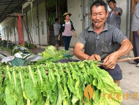 當(dāng)煙葉有綠色變?yōu)榈S,用手捏一下特粘時(shí)即可收獲。用煙刀每個(gè)葉帶煙拐割下后,在對(duì)置一天后即可上繩上架晾曬,在晾曬時(shí)要每隔幾天翻動(dòng)一次,使里外煙葉都曬成黃紅色,提高煙葉質(zhì)量。