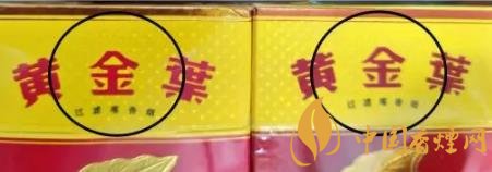 2、正面翻蓋處“黃金葉”文字:真煙“黃金葉”三字立體感強(qiáng),用手觸摸有凹凸感。假煙字體無立體感,手摸無凹凸觸感。(左真右假)