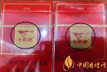 1、商標(biāo)紙上的“七匹狼”商標(biāo)圖案:真煙套印準(zhǔn)確,燙金飽滿,色澤鮮亮,圖案生動(dòng),立體感強(qiáng)。假煙燙金套印容易出現(xiàn)錯(cuò)位,燙金處會(huì)出現(xiàn)漏金現(xiàn)象,顏色相較真煙暗沉,立體感差。(左真右假)