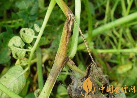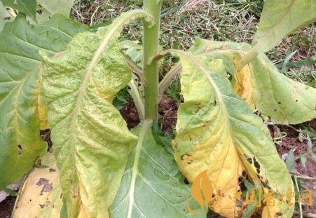 癥狀:煙草青枯病是維管束病害,典型癥狀為枯萎,病株多為一側(cè)枯萎,拔出后可見發(fā)病的一側(cè)支根變黑腐爛,未顯癥的一例根系大部分正常。葉片發(fā)?。撼跗谲浕瑁詾榍嗌?,故稱“青枯病”,隨著細菌充滿葉脈,兩天后葉脈變黑,葉內(nèi)為黃色網(wǎng)狀病斑。莖發(fā)?。撼霈F(xiàn)長形黑色條斑,有的條斑擴展到病株頂部或枯萎的葉柄上。到發(fā)病中后期,全部葉片萎蔫,條斑表皮變黑腐爛,病株莖和葉脈導(dǎo)管變黑,根部也變黑腐爛,甚至莖髓部呈蜂窩狀或全部腐爛形成空腔,僅留木質(zhì)部。橫剖病莖用力擠壓切口,從導(dǎo)管溢出黃白色菌膿。