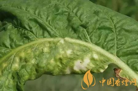 癥狀:幼嫩葉片發(fā)?。翰∪~直立;較大葉片發(fā)?。撼跗谛纬牲S色圓斑,后病斑中間下陷,背面產(chǎn)生灰色或藍色霉層,嚴(yán)重時病斑融合成褐色壞死大斑,病葉皺縮扭曲。常表現(xiàn)系統(tǒng)感染,煙株矮化凋萎。在花、蒴果上也出現(xiàn)病斑。
