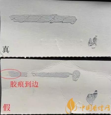假煙條盒端部膠痕與真煙形狀相似,假煙主要識(shí)別點(diǎn):假煙一橫膠延續(xù)到商標(biāo)紙邊緣,真煙膠痕不到邊。