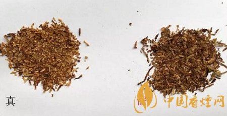 真煙煙絲結(jié)構(gòu)為葉絲,膨脹葉絲,造紙法再造煙葉。假煙煙絲色澤較暗,缺乏油分較干燥,假煙主要識(shí)別點(diǎn):假煙可見膨脹梗絲,真煙沒有。