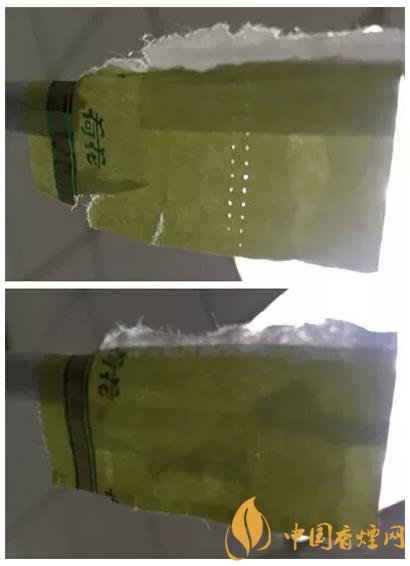 真品卷煙接裝紙上有2排激光打孔,孔點均勻、排列整齊;假煙接裝紙雖然也有2排打孔,但孔洞較小且未打透,孔點排列不規(guī)則。