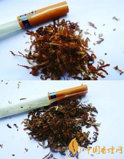 真品煙絲以精選國內(nèi)外自然醇化兩年以上的優(yōu)質(zhì)烤煙為原料,切絲均勻一致,顏色均為金黃色,葉絲比例高;假煙煙絲多為劣質(zhì)煙葉經(jīng)過化學(xué)藥劑催化加染加工而成,煙絲表面多存留一些白色香精粉末,煙絲顏色多為褐色,與真品特征存在明顯差異。(上真下假)