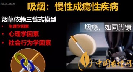 但是煙草成癮不是單單只有生理學因素,不然,中國就不會有3億吸煙者,不會十年吸煙率幾乎沒有變化。實際上,在戒煙的過程中,比克服生理學因素更難的是心理學因素和社會行為學因素。煙癮如同腳鐐,拴在人身上很難擺脫。