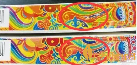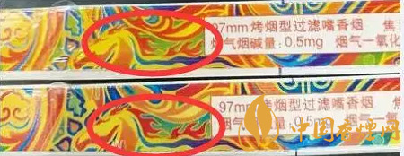 如下圖標示,此處圖案真煙為藍色,假煙則變成了綠色;真煙的線條為黃色,假煙變成了紅色;真煙為綠色的圓珠外面為藍色的底色,假煙都變成了綠色。(上假下真)