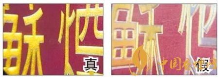 真煙:燙金字體線條清晰、不漏金,金色部分成色純正。假煙:燙金字體線條不清晰,有漏金現(xiàn)象,金色部分成色暗淡。