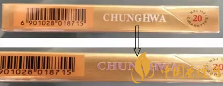 “中華”(雙中支)產品小盒采用硬盒(雙包)翻蓋的包裝形式,煙支規(guī)格為89mm(長)*20mm(圓周)。小盒側面英文字母“CHUNGHWA”采用熒光變色防偽油墨;在紫外光照下,白色“CHUNGHWA”會變成紫紅色,一段時間后紫紅色褪去。
