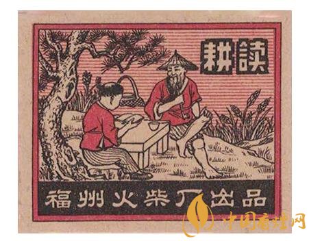 而福州火柴廠出品于1954年的“耕讀”(圖4)火花,則表現(xiàn)了一位頭戴斗笠的老農(nóng)在春耕間隙,翹著二郎腿坐在田邊青松下的石頭上,胳膊肘斜放于在石桌,面帶微笑,抽著旱煙陪伴孫兒讀書的場景。再看老農(nóng)身后的簍子,以及桌上的碗筷,似乎是描寫這個(gè)老農(nóng)在吃完孫子給送的飯后,不忘“耕讀傳家”祖訓(xùn),利用吃飯休息間隙,輔導(dǎo)孫子多學(xué)點(diǎn)知識。