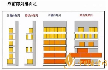 與擺放整齊的目的一樣,靠前陳列能較好地展示商品形成量感和美感,充分利用陳列工具來(lái)增強(qiáng)陳列效果。如下圖所示: