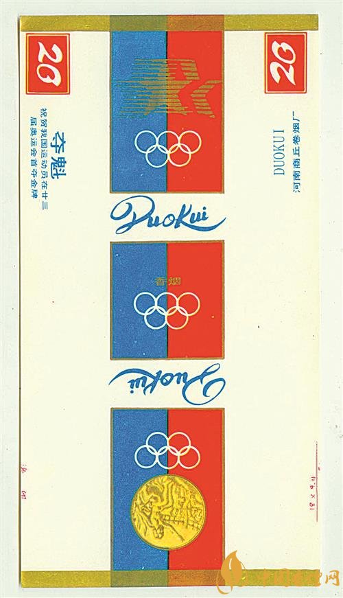 1984年,在美國(guó)洛杉磯舉行的第23屆夏季奧運(yùn)會(huì)上,我國(guó)射擊運(yùn)動(dòng)員許海峰實(shí)現(xiàn)了我國(guó)奧運(yùn)金牌零的突破。為祝賀我國(guó)運(yùn)動(dòng)員取得好成績(jī),上世紀(jì)80年代,河南商丘卷煙廠出品了多個(gè)版本的“奪魁”煙標(biāo)。其中一個(gè)版本的“奪魁”煙標(biāo)(圖①),圖案采用紅色、藍(lán)色和金色為主要配色,主版圖案為洛杉磯奧運(yùn)會(huì)會(huì)徽,左側(cè)位置印有“祝賀我國(guó)運(yùn)動(dòng)員在廿三屆奧運(yùn)會(huì)首奪金牌”字樣,副版上印有奧運(yùn)會(huì)金牌圖案和奧運(yùn)五環(huán)標(biāo)志。同時(shí)期,山東兗州卷煙廠出品了“五洲”煙標(biāo),主、副版圖案分別為第23屆夏季奧運(yùn)會(huì)會(huì)徽和奧運(yùn)五環(huán)標(biāo)志。