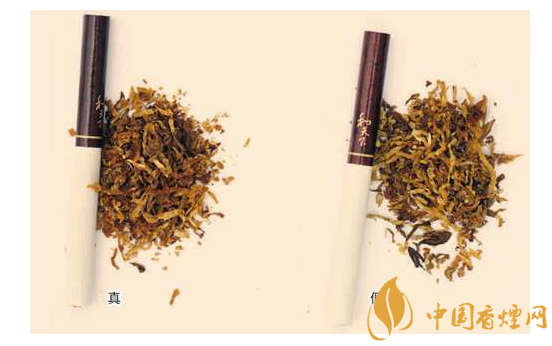 四、煙支過濾嘴及煙絲差異對比:真煙煙支采用復合濾嘴,煙絲切絲寬度均勻,煙絲疏松、光澤油潤性好、呈檸檬黃色,煙絲結構為葉絲和少量膨脹梗絲;假煙煙支采用普通濾嘴,制絲工藝簡單,煙絲寬度不均勻,有少量梗絲,未經(jīng)過膨脹處理。