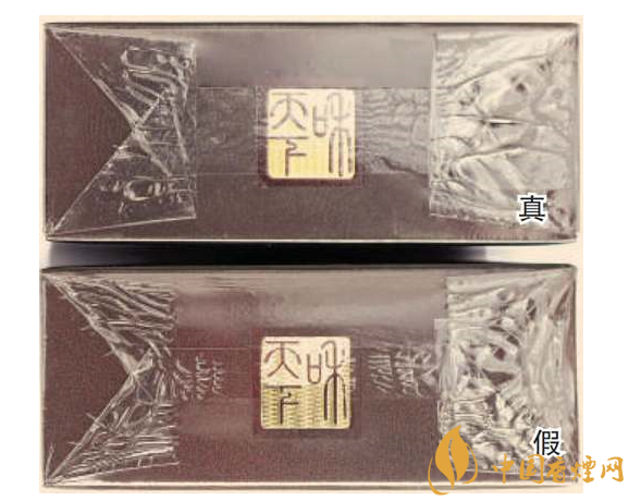 一、正面商標紙印刷工藝差異對比:真煙商標紙采用復合鐳射銀卡紙,膠印和絲網(wǎng)印刷,“和天下”字體采用壓凸燙金工藝,用手摸凹凸感較明顯,且字體筆畫較粗,商標紙上字體、拼音、花紋看上去有較清晰的豎線;假煙一般為高清掃描仿制印刷,“和天下”字體用手摸凹凸感不明顯,且字體筆畫較細,商標紙上拼音、花紋等處豎線較模糊。