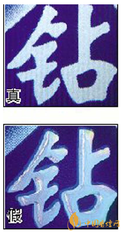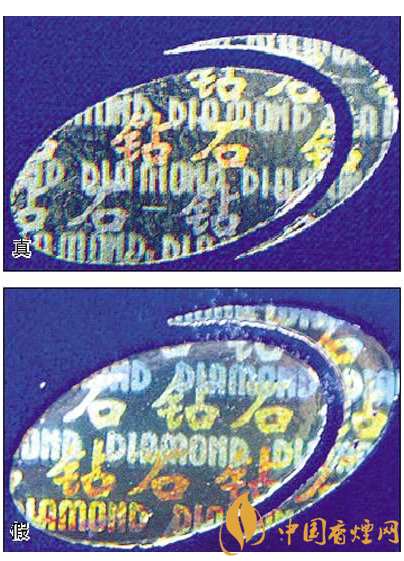 五看鉆石圖案:真煙鉆石圖案印刷清晰,色彩感強,內(nèi)有微縮英文字母“DIAMOND”,圖案無凹凸感;假煙印刷不清晰,用手摸上去有凹凸感。