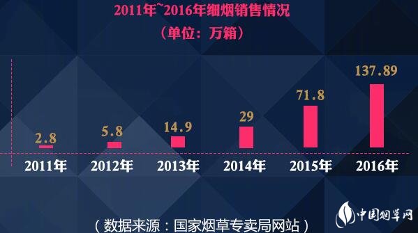 據(jù)調(diào)查顯示2014年是細(xì)支煙產(chǎn)品突然爆發(fā)的一個(gè)關(guān)鍵時(shí)間點(diǎn)。從這一年開始,細(xì)支煙的品牌和規(guī)格,都開始呈現(xiàn)大幅上漲的趨勢(shì)。
