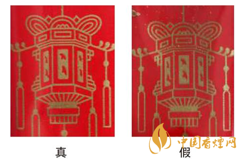 小盒側面燈籠圖案的印刷對比:真煙的三個小方格中,下面那個方格的最下面那一橫為水平的;假煙下面那個方格的最下面一橫非水平,呈一定角度傾斜。