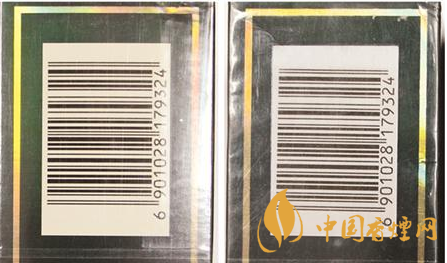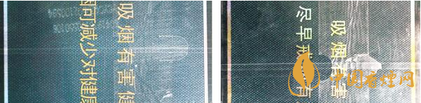 煙用包裝膜材質(zhì)及條形碼對(duì)比:真品卷煙條包裝膜材質(zhì)光滑,均勻無皺褶,條形碼區(qū)域呈淡黃色,套色均勻清楚。假煙條包裝膜材質(zhì)粗糙,有不均勻皺褶,條形碼區(qū)域?yàn)榘咨?,套色邊緣放大后模糊不清?/p>