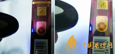 未采用熒光防偽技術(shù)時(shí),觀察“防偽區(qū)”,真煙“防偽區(qū)”油墨厚,字體清晰;假煙反之。